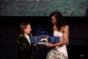 Paola Malanga presents Nia DaCosta with the Progressive Lifetime Achievement Award at the Rome Film Festival